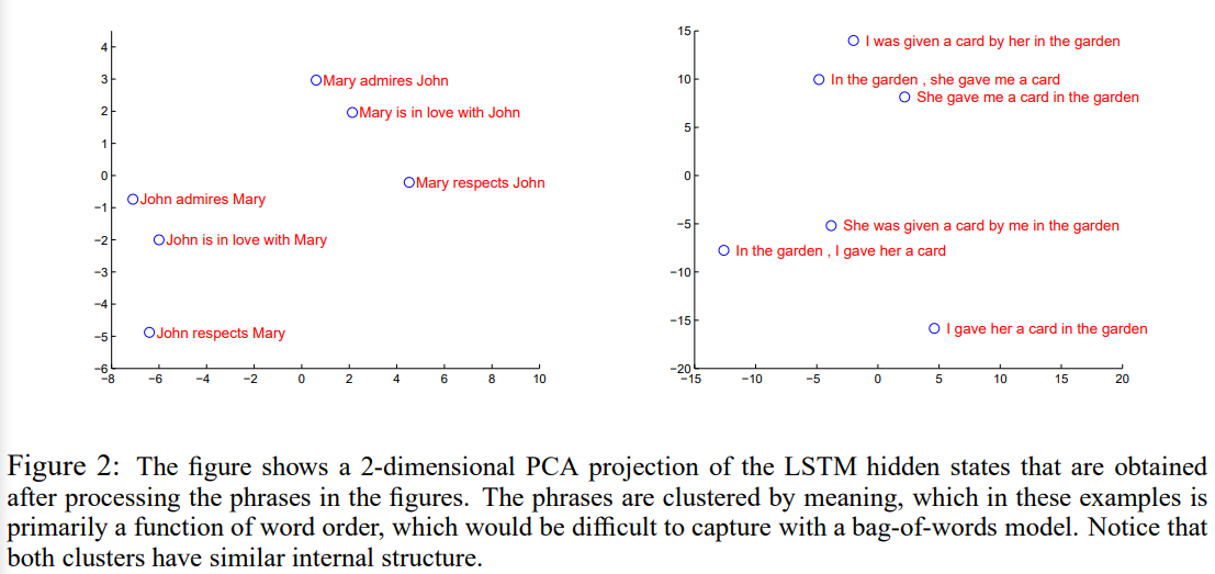 Figure 2는 hidden state(인코더에서 입력 문장을 표현한 벡터)를 2차원으로 PCA 투영한 결과입니다. 유사한 의미를 갖는 문장끼리 군집을 형성하는 것을 확인할 수 있습니다. 특히, 이 벡터 표현이 단어의 순서에도 민감하고, 능동태와 수동태 문장의 의미도 잘 이해함을 확인할 수 있습니다.