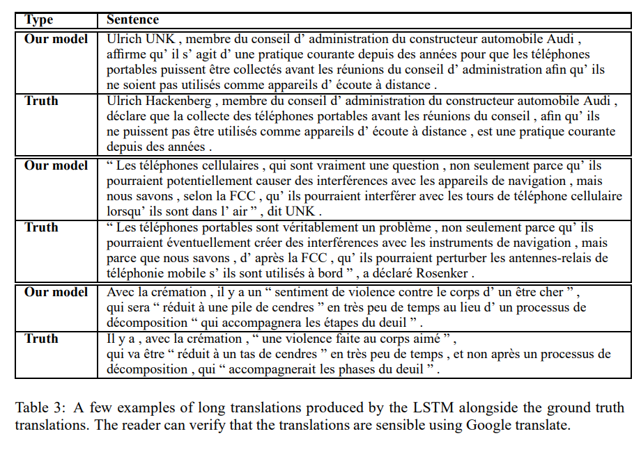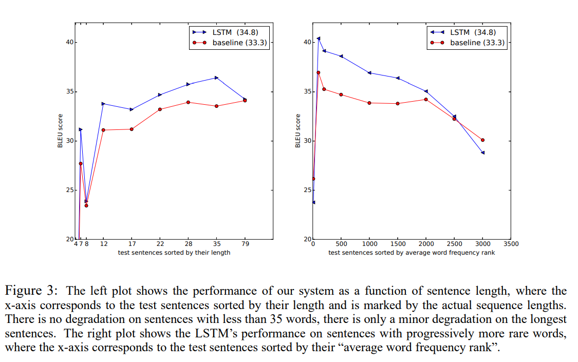 주요 성과는 다음과 같습니다. WMT'14 데이터셋을 사용한 영어 - 프랑스어 번역 작업에서 단순한 left-to-right beam search decoder를 사용한 5개의 multilayer LSTM을 앙상블 학습시킨 논문의 모델은 34.81점의 BLEU 점수를 얻었습니다. 이는 신경망을 사용한 직접적인 번역에서 얻은 점수 중에서는 역대 최고점입니다. 이 점수는 80k의 vocab size를 갖고 얻은 점수이며, 이 어휘 목록에 포함되지 않은 단어에 대해서는 벌점을 받았습니다. 따라서 비교적 작은 어휘 사전을 가진 신경망 모델들은 기존의 phrase based SMT system의 성능을 뛰어넘을 수 있는 여지가 많이 있습니다.